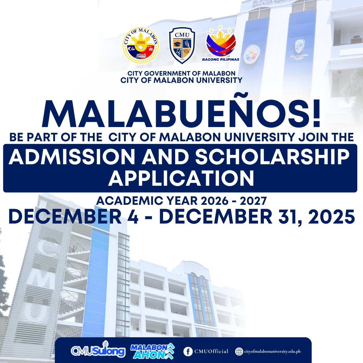 City of Malabon University Undergraduate Admission and Scholarship Application for Academic Year 2026-2027 is OPEN! CMU Undergraduate Admissions & Scholarship Call! Your future starts here! The City of Malabon University is now accepting applications for Academic Year 2026-2027. Application Period: December 4 – December 31, 2025. APPLY ONLINE NOW! • Admission Form: https://bit.ly/CMUAdmission2026 (or scan […]